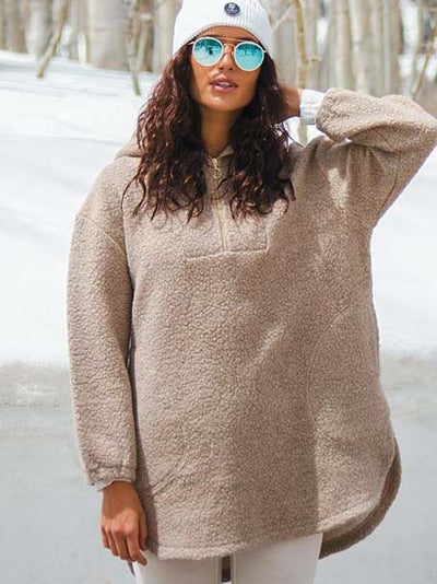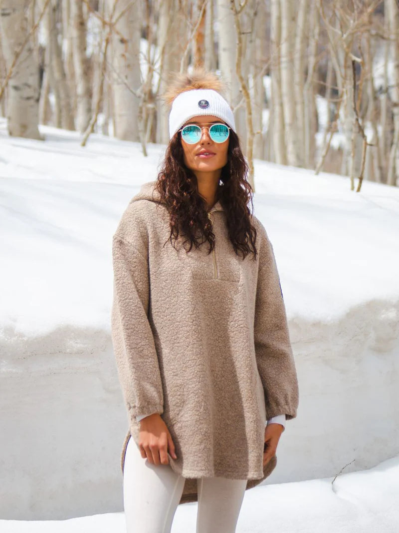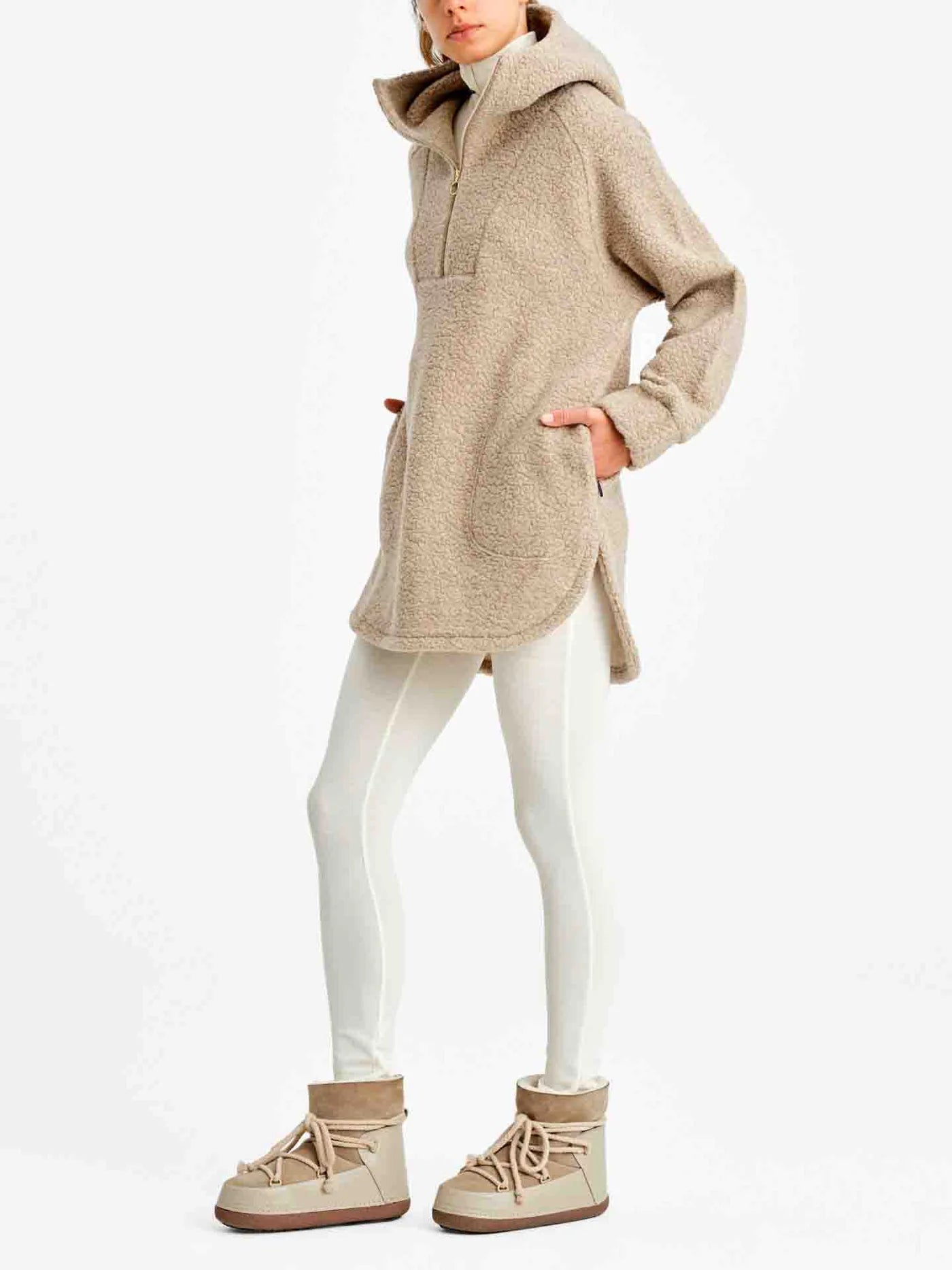 The fabric used for the Alta collection, is a pile quality made with 80% merino wool, knitted with a shearling look. We have made an over-sized hoodie which can be worn over your ski pants for aprés ski, or as a cosy layer over your gym clothes on your way to and from the studio.