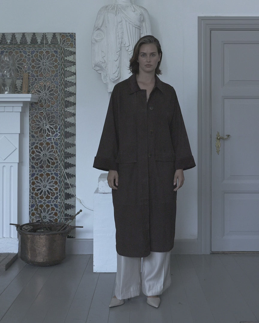 A beautiful and exclusive slightly oversized coat in suede with a light and airy look, designed in a straight model that creates a stylish and elegant look. The model has a little width in the cuffs of the sleeves with a fold in soft baby velvet, and the collar is also made of velvet for a luxurious finish. The coat closes with buttons and has front pockets with flaps that combine functionality and design.