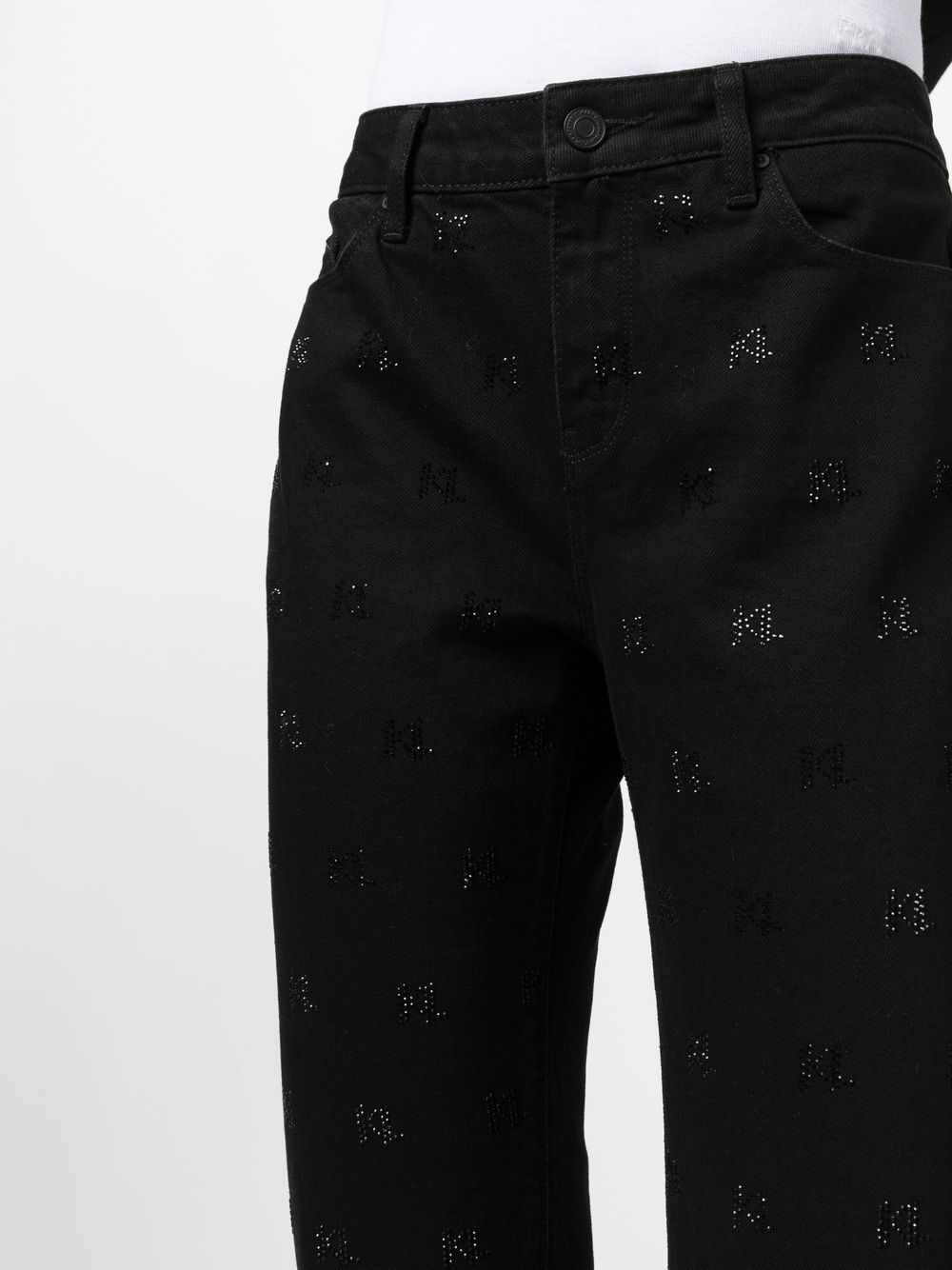 Sparkle-monogram straight jeans from KARL LAGERFELD featuring black, cotton, straight leg, rhinestone embellishment, mid-rise, belt loops, front button and zip fastening, classic five pockets and cropped.