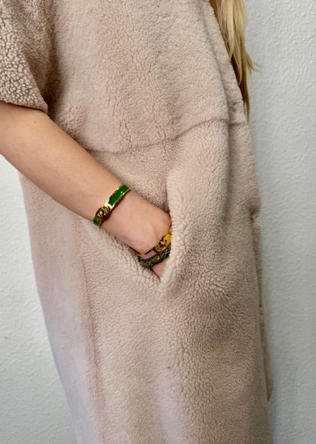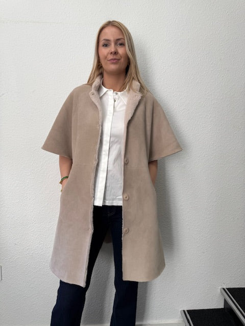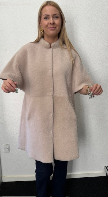 En meget smuk nyhed, som er perfekt til overgangsvejr eller blot lidt kølige dage. Modellen har plads om barmen og livet, hvor de brede ærmer fortsætter i skæringen hen over front og ryg. Dette giver en meget flot halv cirkelformet overdel, både for og bag. Jakken lukkes med trykknapper og har en lav opretstående pelskrave, samt lommer. En meget enkel og tidløs model, der altid vi være flot til din basisgarderobe.