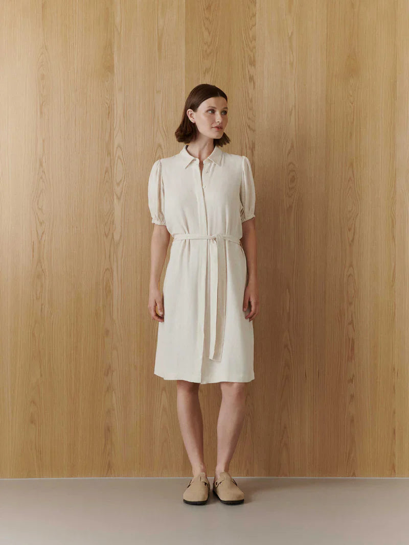 Aicha kjolen er fremstillet i en blød blanding af viskose og hør, der gør den let og åndbar. Kjolen har korte ærmer med fine pufdetaljer ved skuldrene og et bælte i taljen, der fremhæver figuren - en skøn kombination af elegance og komfort.