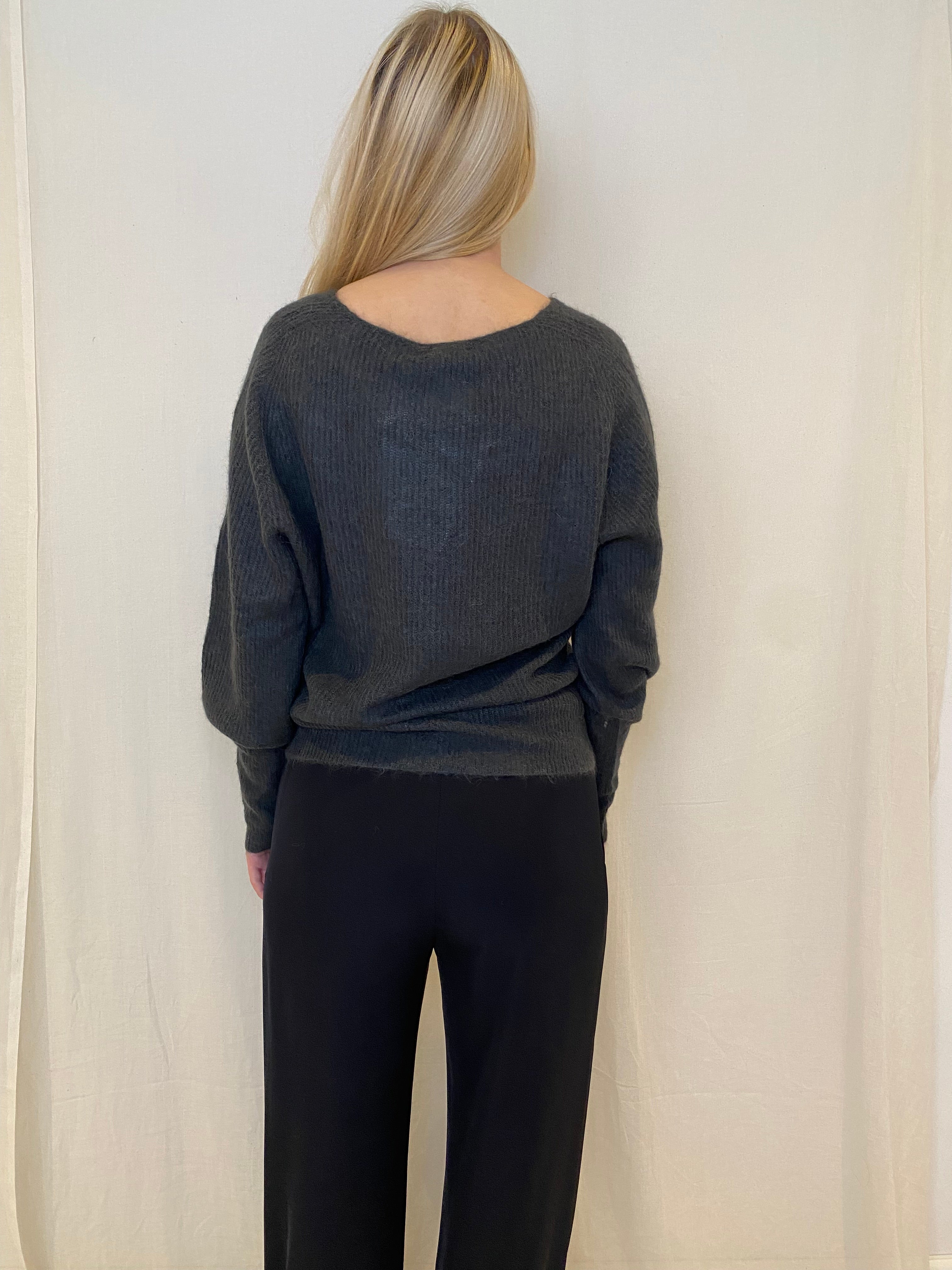 V neck Pullover in baby alpaca and extra fine merino wool characterized by a very soft and thinness making.The combination of these two fibers creates a cozy, warm and snug sweater that wraps around the body.Regular fit with balloon-sleeve sweater.