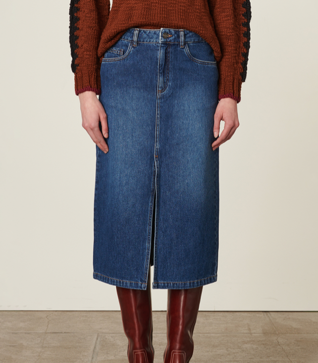 Rigtig fin og lækkert demin skirt, med traditionelt udtryk som jeans, med lommer og lynlås til lukning. Modellen har slids fortil og går til ca midt på skinnebenet, har trenser til bælte og baglommer. Superflot til "Denver Jacket"