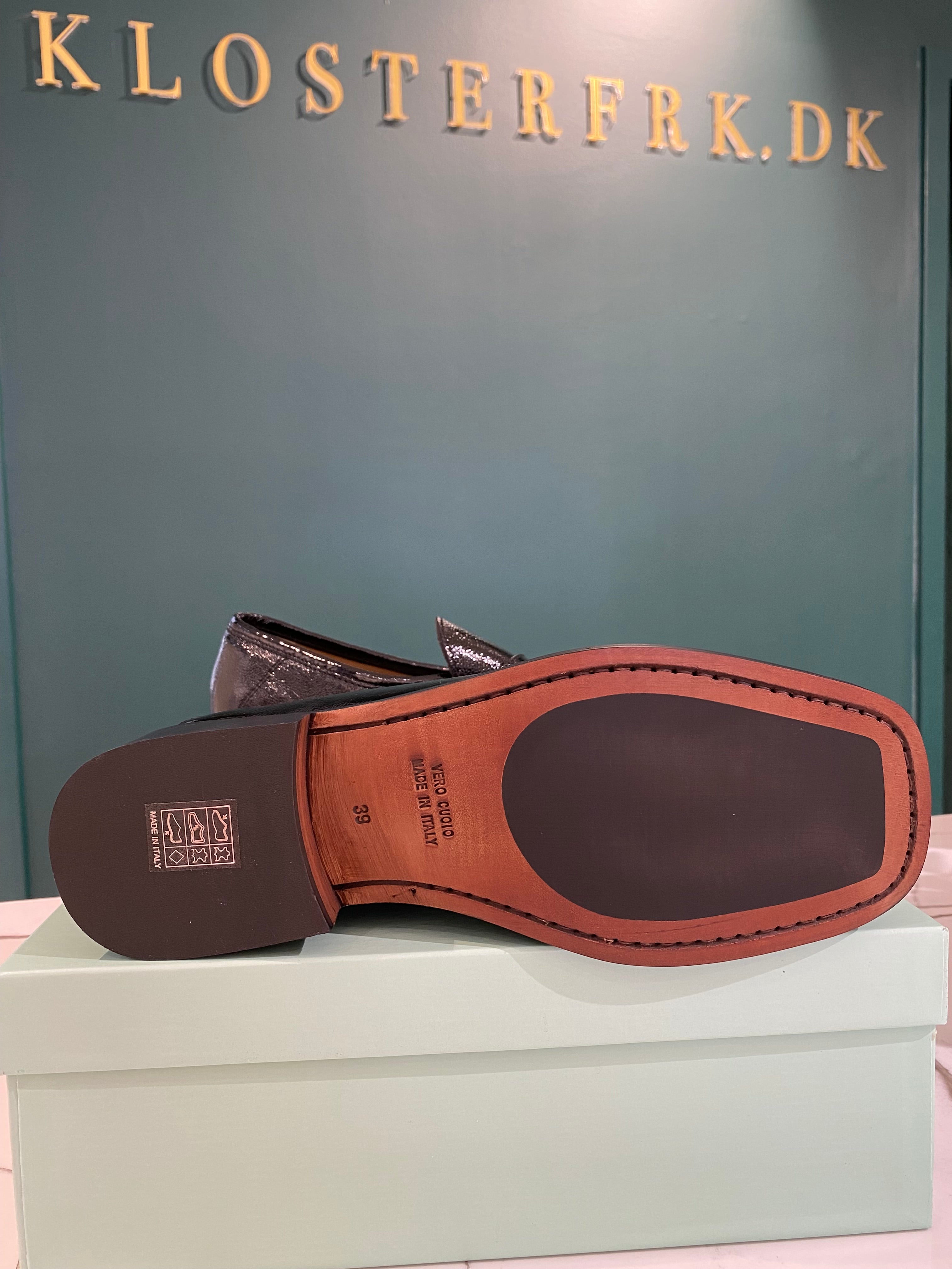 Materiale: Kalveskind med lakeret prægning. Skindsål med gummi belægning.