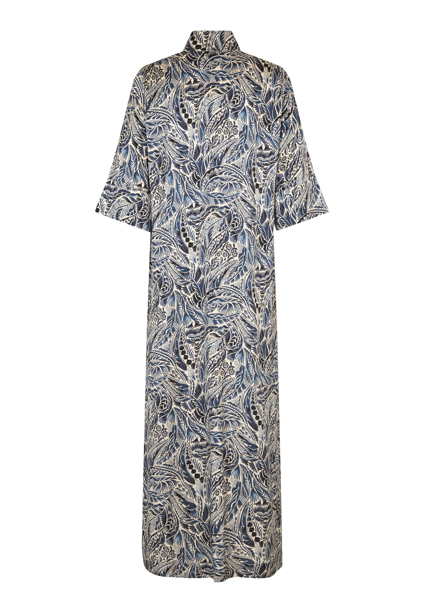 Den smukkeste tunikakjole med kimonoærmer og høje slidser i siderne. kjolen har en opretstående krave, som slutter i et V med en enkel knap.