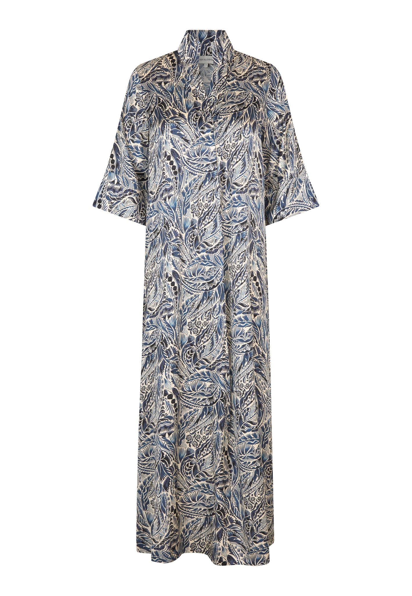 Det blade- og rankelignende mønster er i afdæmpet og smukke gråblå farver