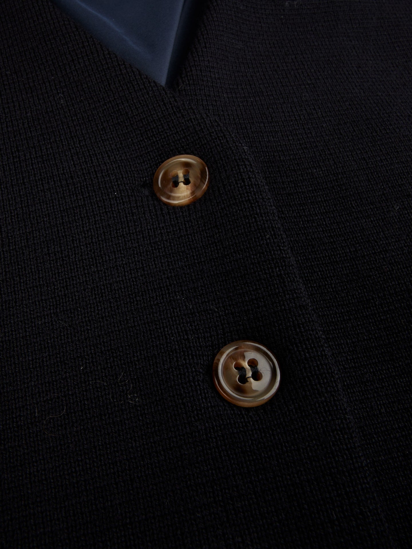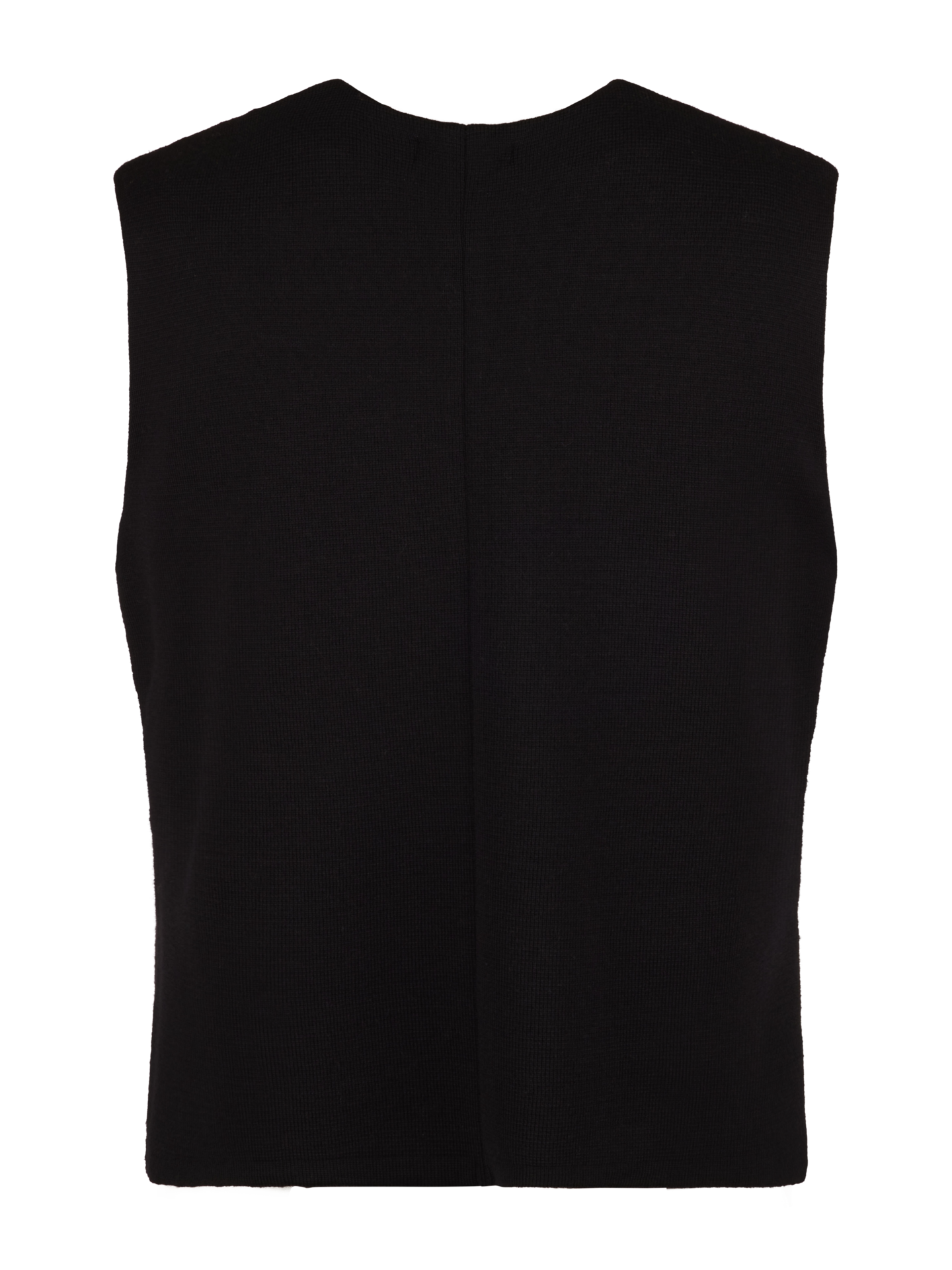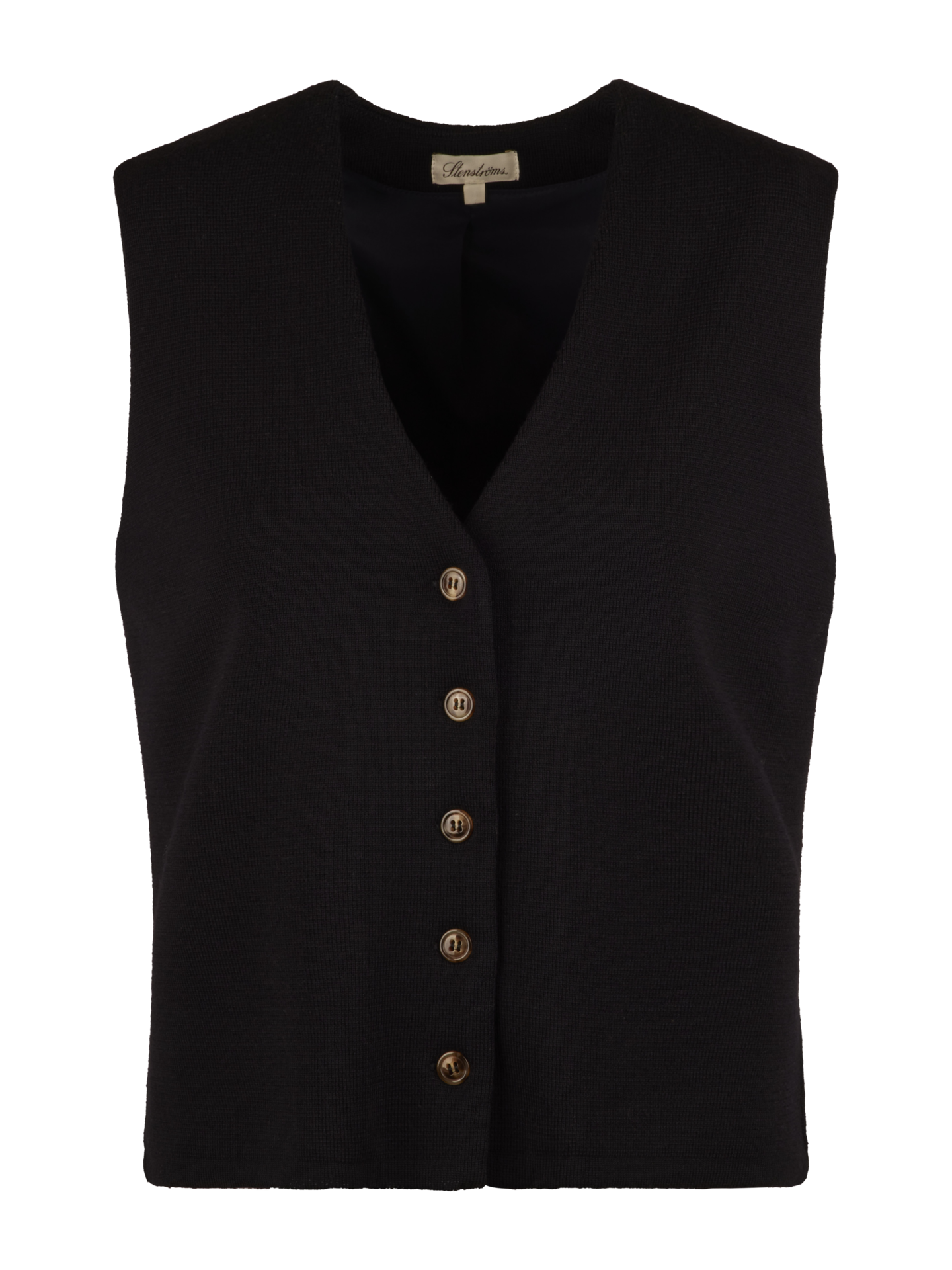 Denne vest er fremstillet i merinould og har en normal pasform. Den har brune knapper.