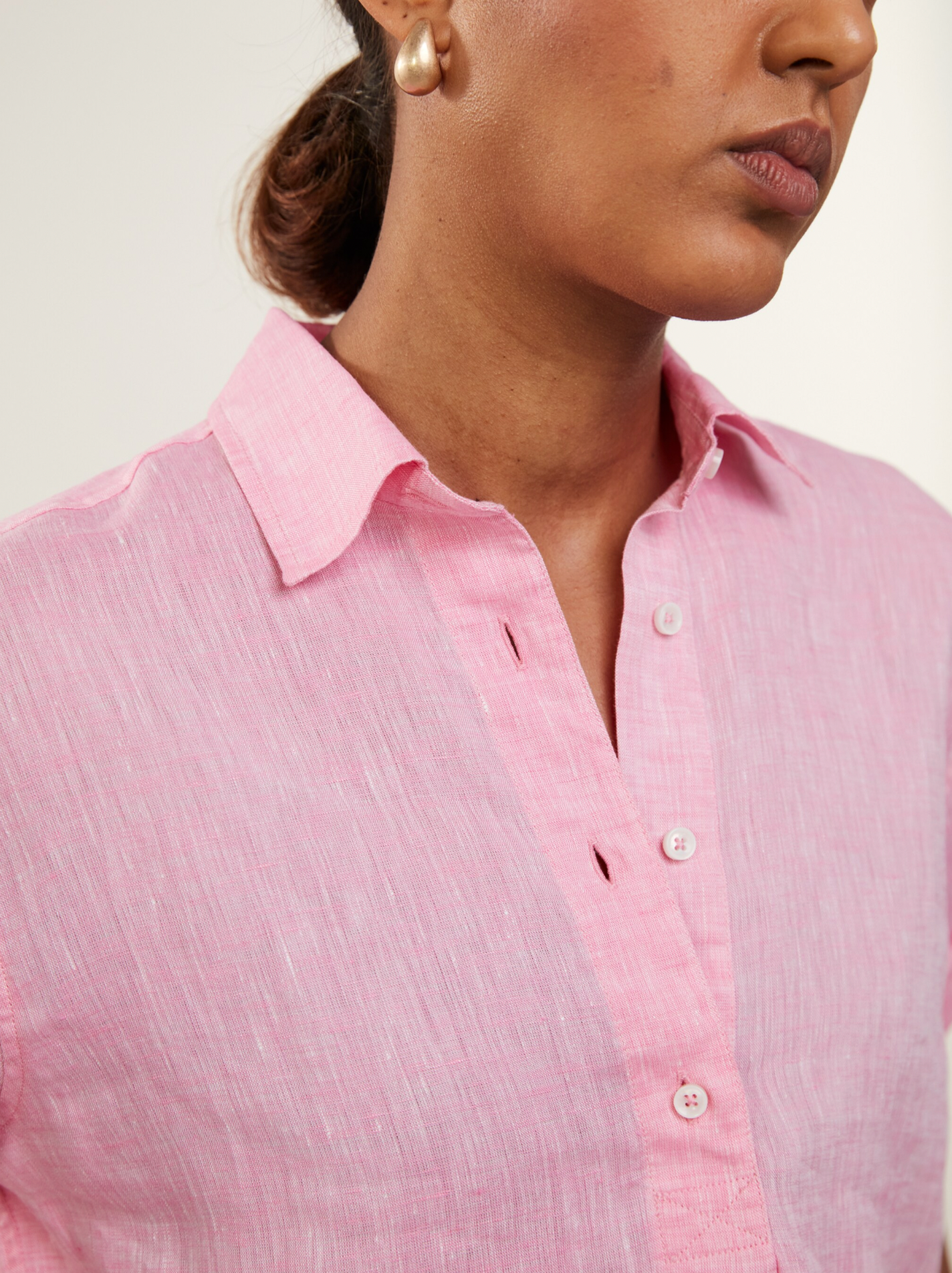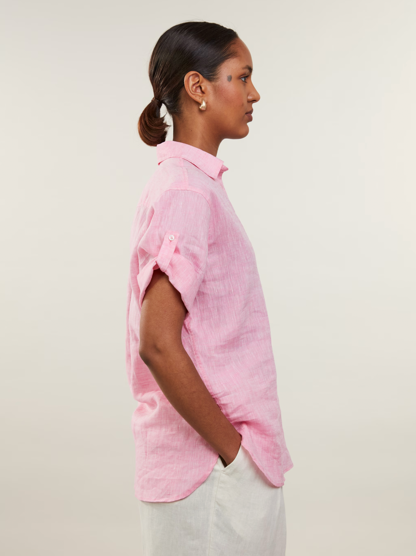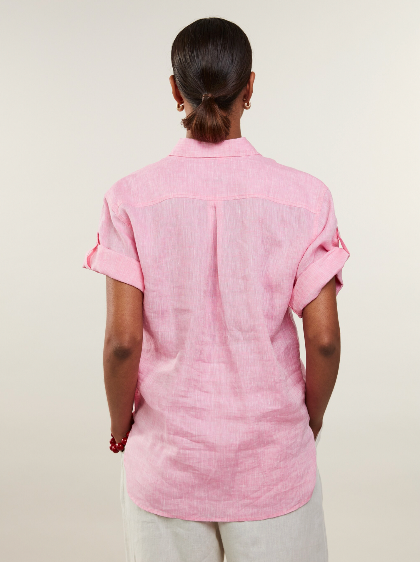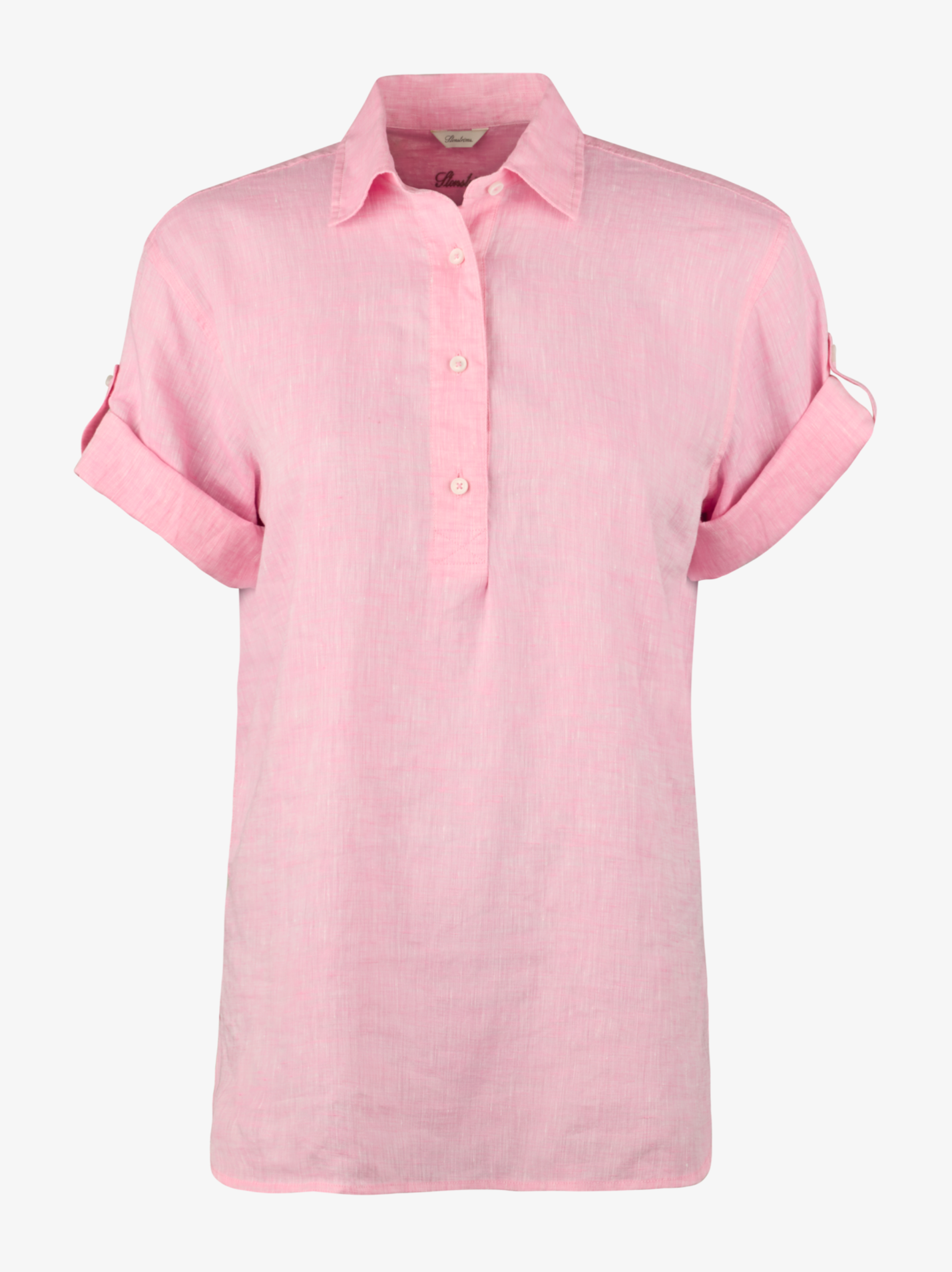 This popover shirt is made of linen and has an oversized fit. The shirt is detailed with short sleeves that can be rolled up and fastened with a strap and button.