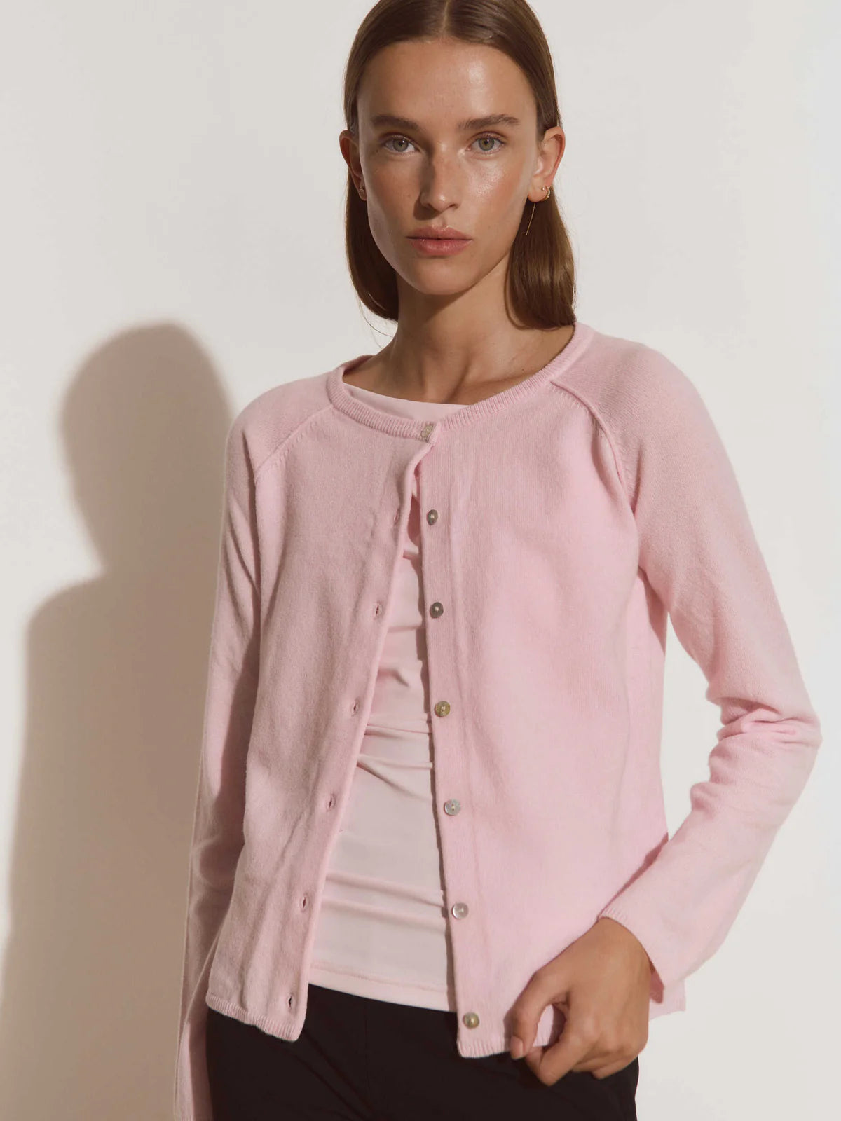 Helt klassisk og smuk cardigan med rund halsudskæring, raglanærmer og perlemorsknapper foran. Cardiganen er fremstillet i en dejlig blanding af cashmere og uld, hvilket gør den meget blød og behagelig at have på. Sæt den evt sammen med Babette toppen i samme farve, og du har et dejligt uformelt og alsidigt udtryk.