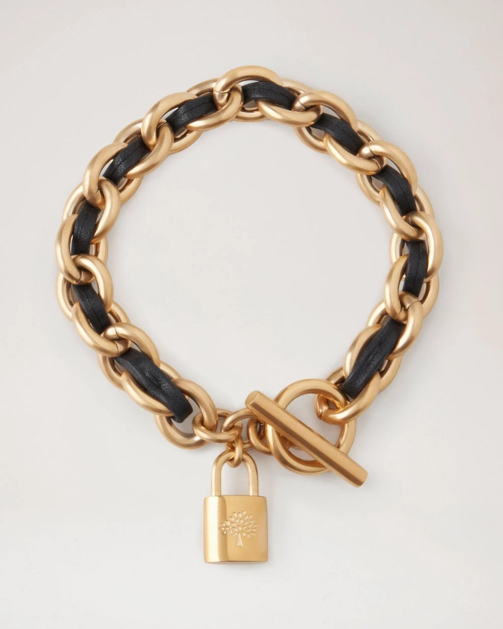 Smukt og klassisk lænke armbånd med lædersnor mellem leddene, samt vedhæng af Mulberrys ikoniske hængelås.