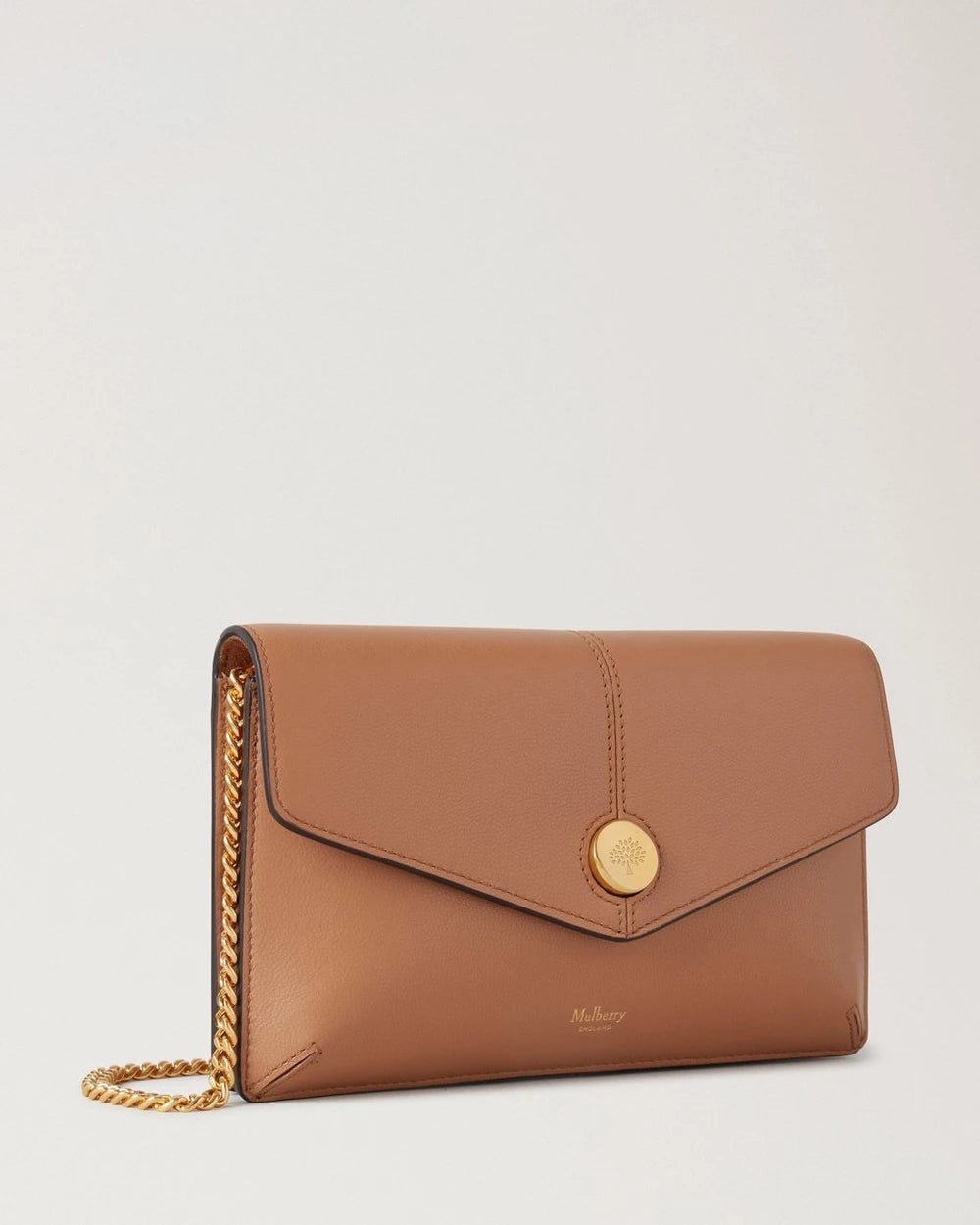 Den fineste lille taske, der netop har plads til din telefon, kort, læbepomade, nøgler og det essentielle til turen på cafe, med på job eller restaurant. Den gyldne kæde, kan tage af, og således har du en meget elegant clutch. Smuk trykknap med Mulberrys smukke logo.