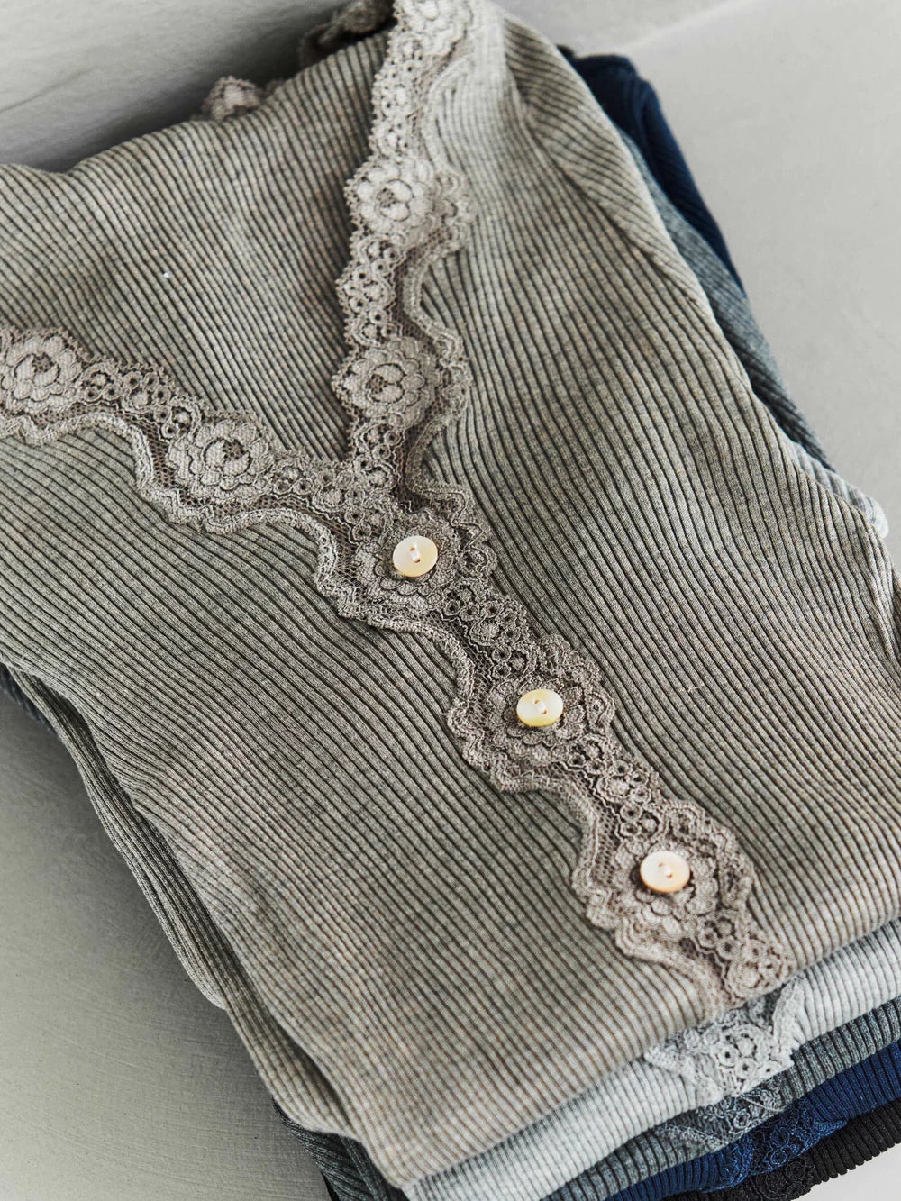 Den utrolig populære og klassiske blondecardigan fra Rosemunde med perlemorsknapper. Cardiganen er strikket i meget fin ribstrik og passer perfekt sammen med Babette Top i samme materiale. En sikker vinder til din hverdag.