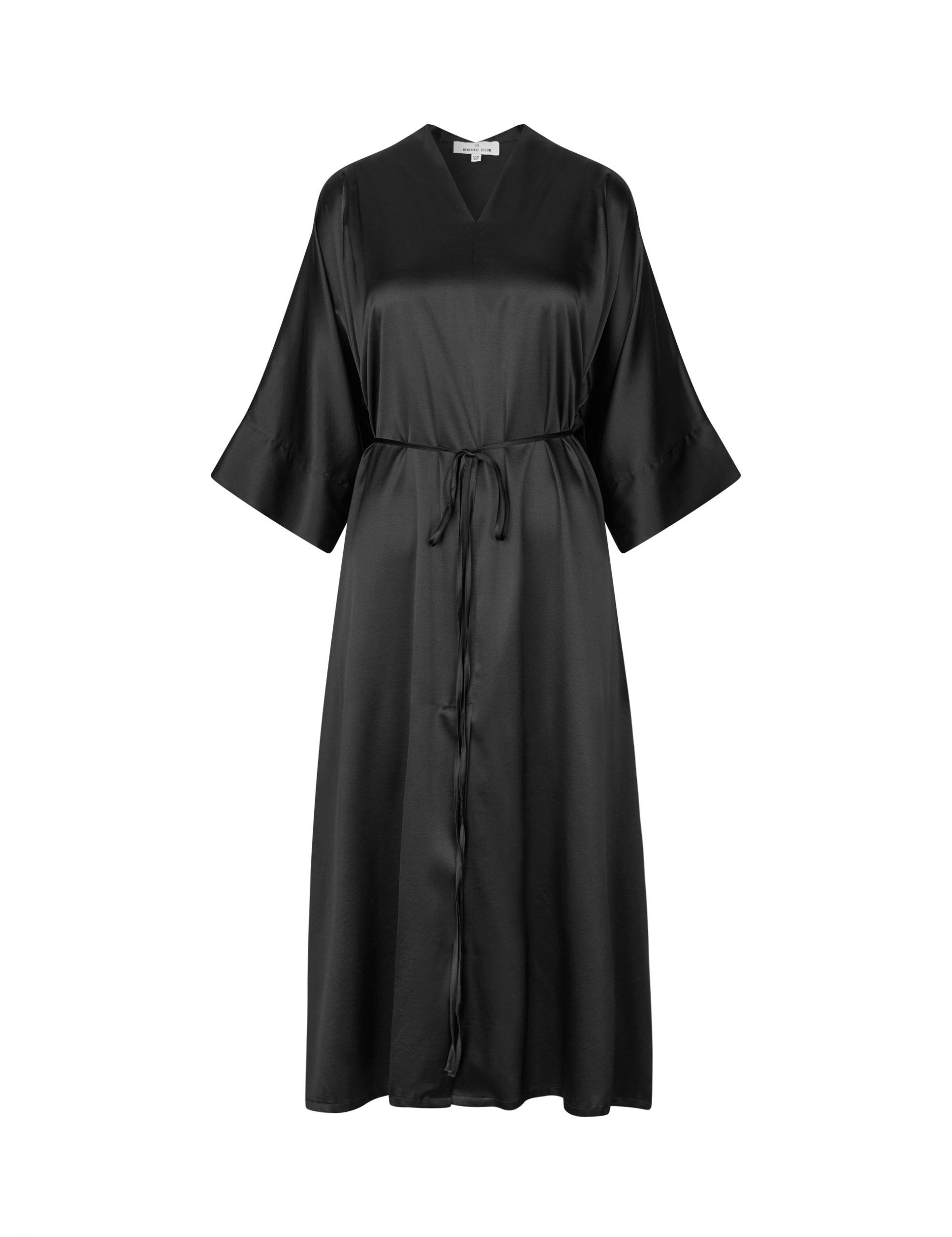 Smuk one size kjole I 100% silke. Kjolen kan vendes, så du får to forskellige udtryk. Kjolen er en løs model, men med bindebåndet, kan du skabe den stil du ønsker, om kjolen skal være løs eller markere taljen.