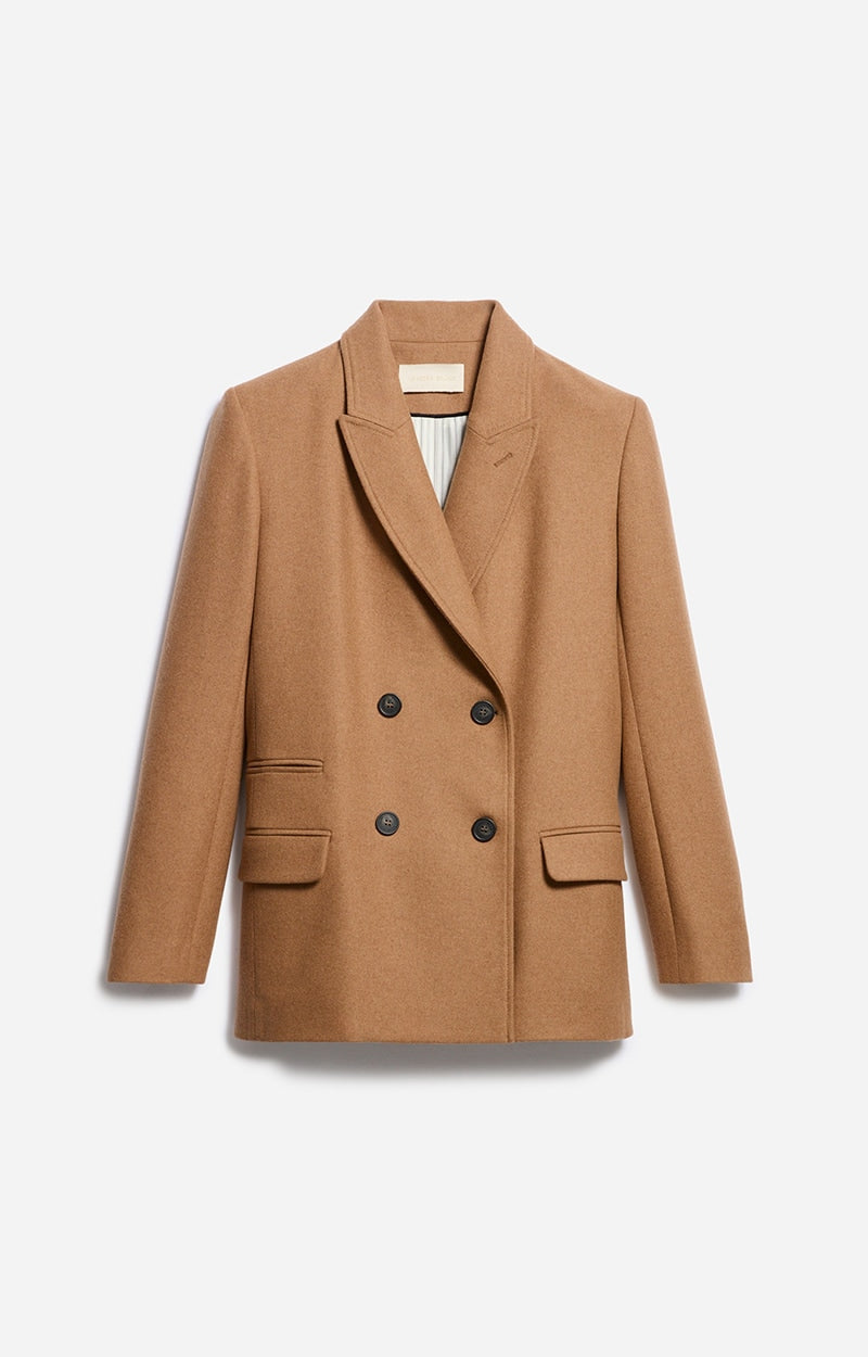 Damarys kostymjacka återuppfinner herrgarderobskoder med en elegant karamellfärg. Tillverkad i ullblandning, den har ett strukturerat snitt, epaletter och caban-inspirerad dubbelknäppning. Tack vare sin tjocka ull ger tyget bra stöd för en oklanderlig passform. Bär den med jeans för att få färg till din outfit, eller som en mellansäsongsjacka. Tveka inte att översize om du vill ha ett mer överdimensionerat snitt.