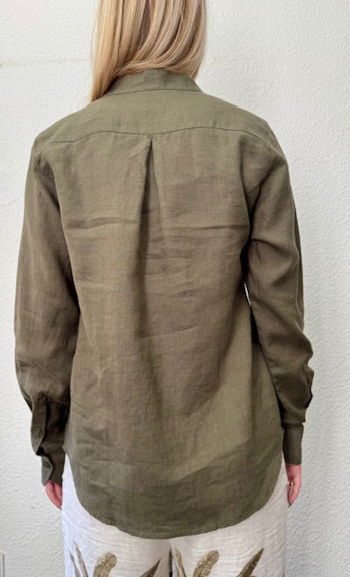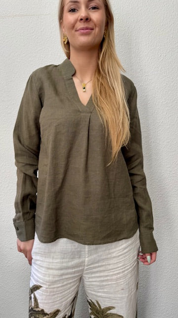 Ännu en av de härliga skjortblusarna i linne från Stenström. Denna version har gott om plats ovanför bysten och runt midjan, med ett fint Wienerveck i fortsättningen av v-ringningen. Modellen har klassiska muddar och stängs med platta knappar vid handleden. Kombinera den med dina favoritjeans, shorts eller en kjol - den passar till dem alla.