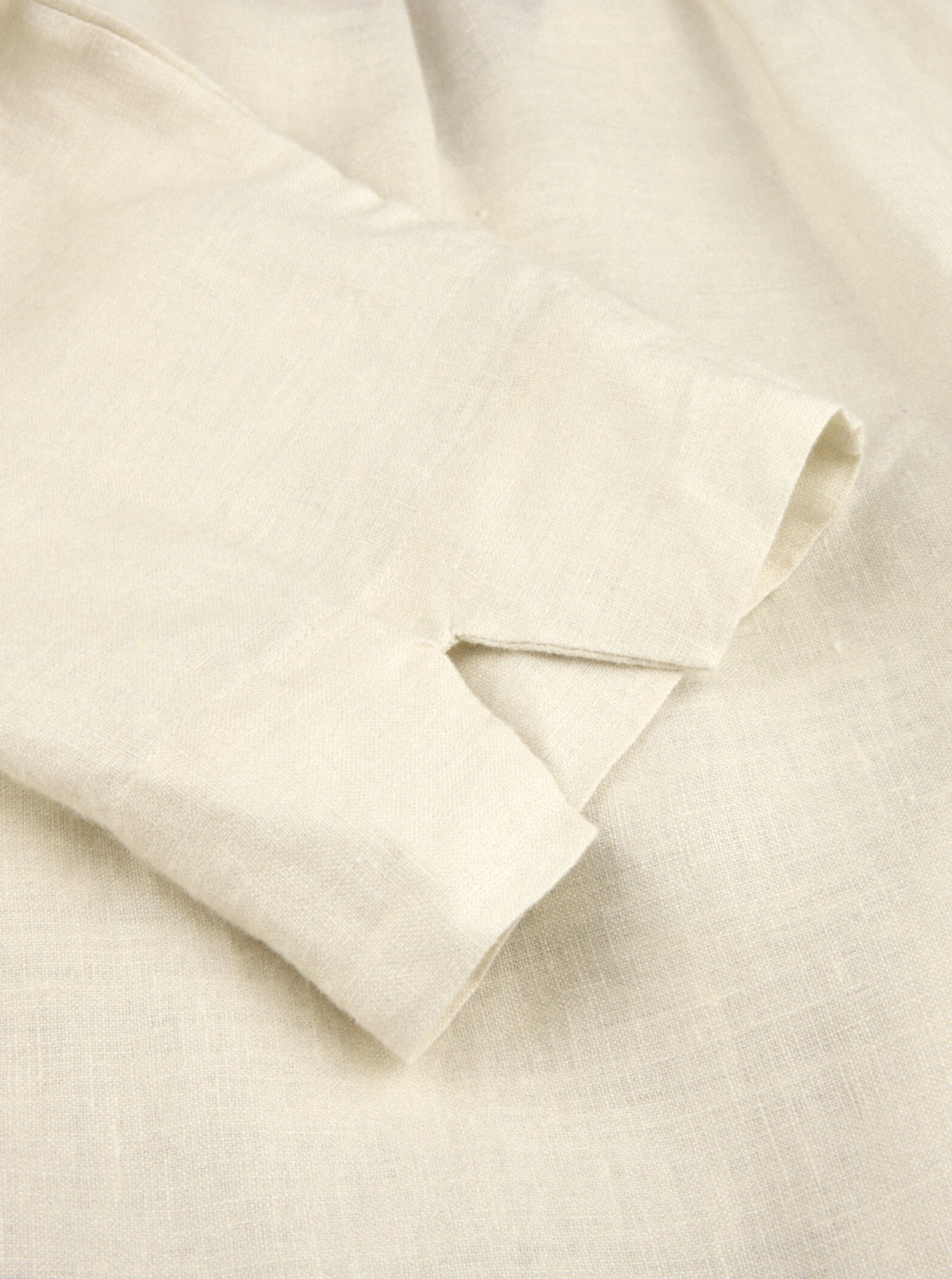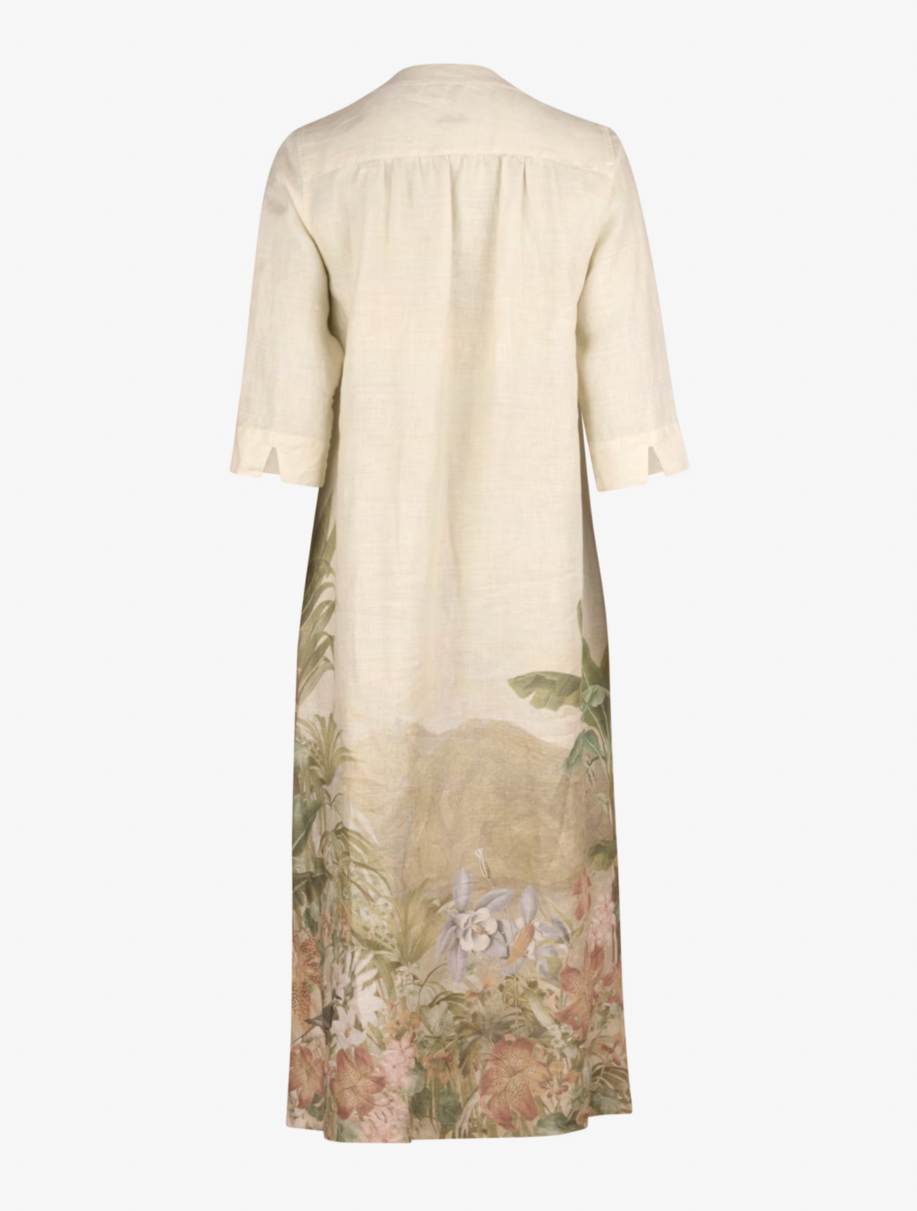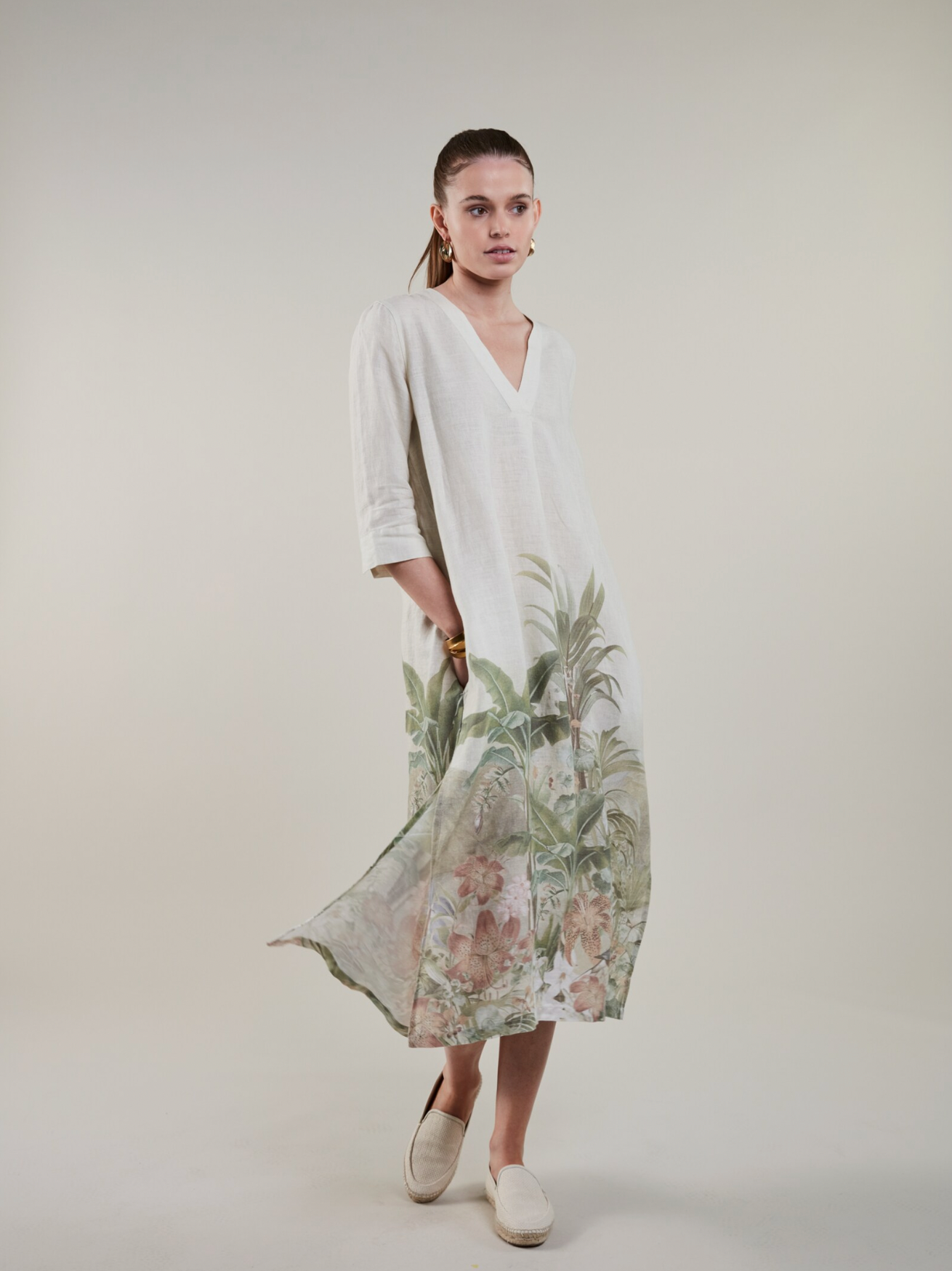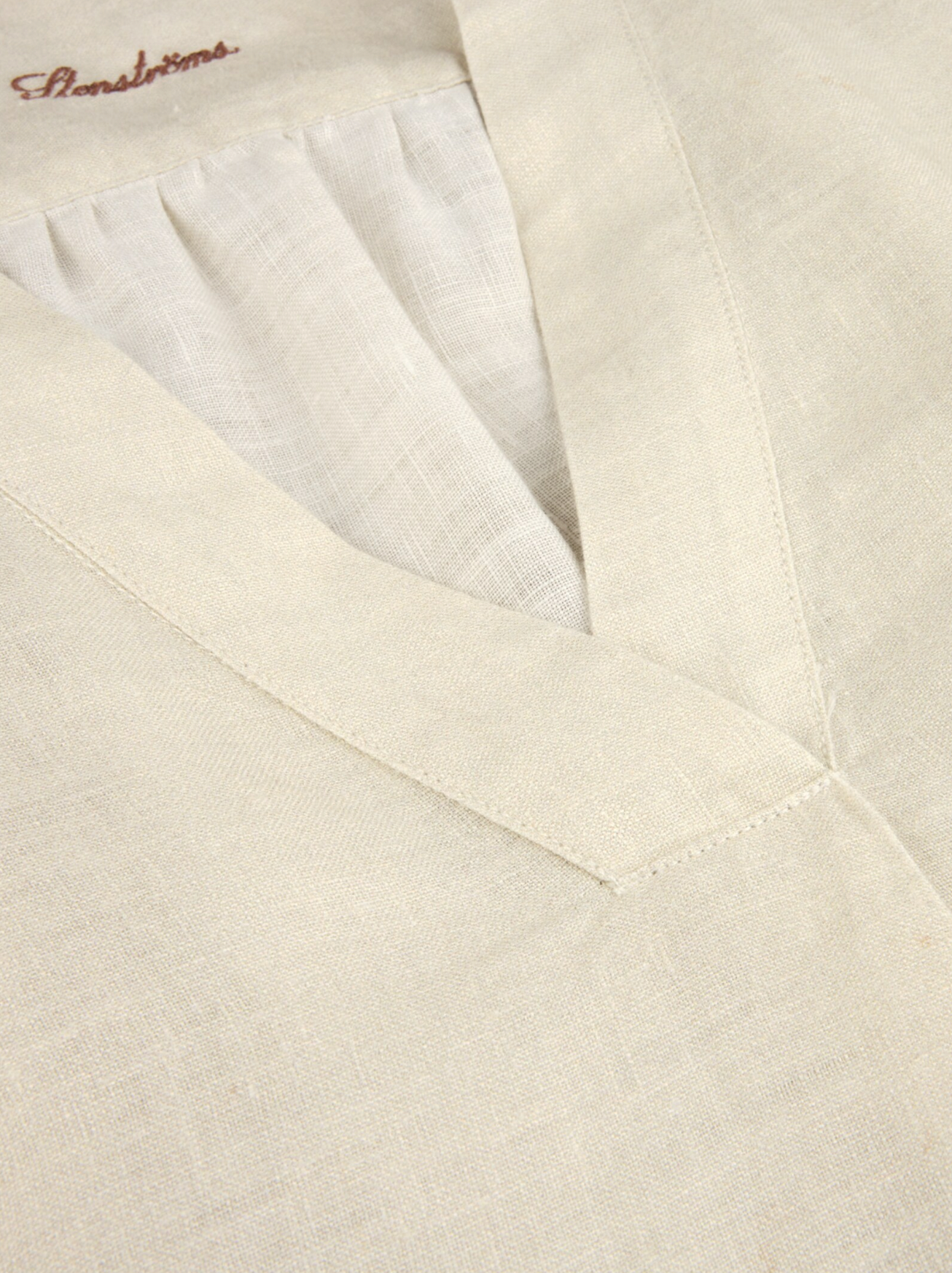 En av de populära i serien av linneklänningar i tunikamodellen. Klänningen har en härlig rymd och ger god rörelsefrihet med plats bak och veckad framsida. Modellen har 3/4 långa ärmar, fickor i sidsömmen, samt en halsringning som slutar i V, men inte särskilt djup.