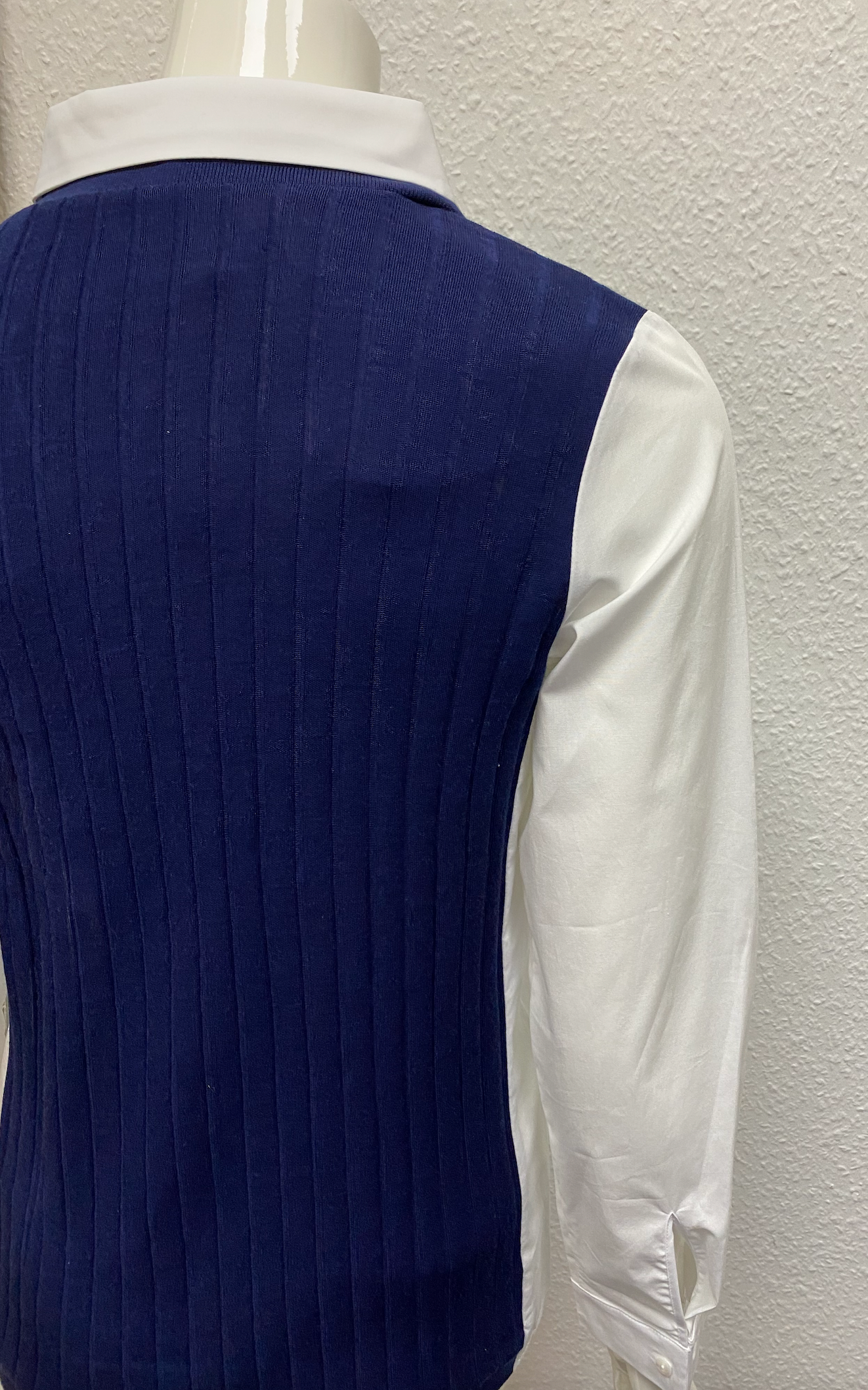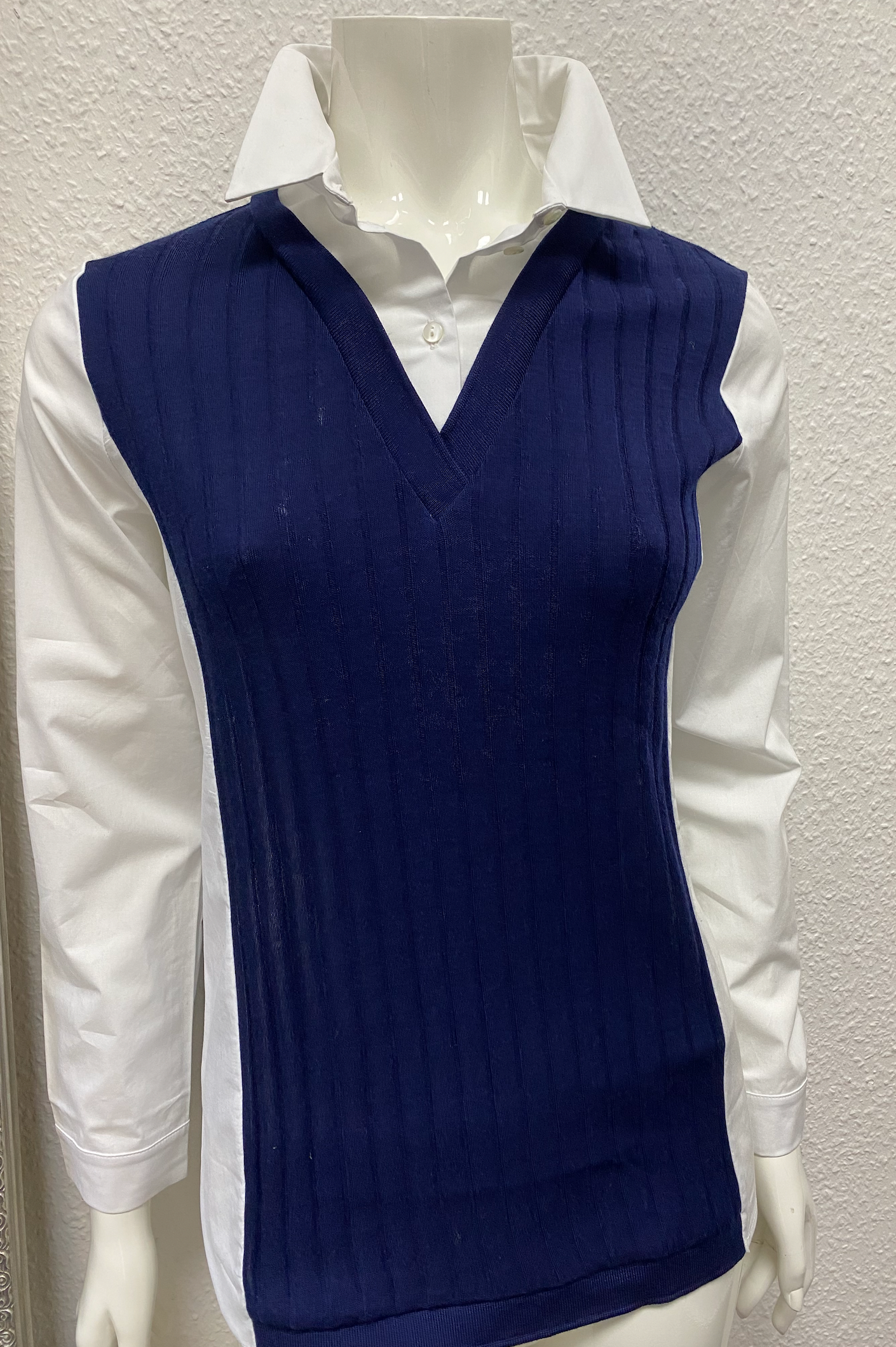 Färg: Vit skjortdel och marinblå mittdel/väst.