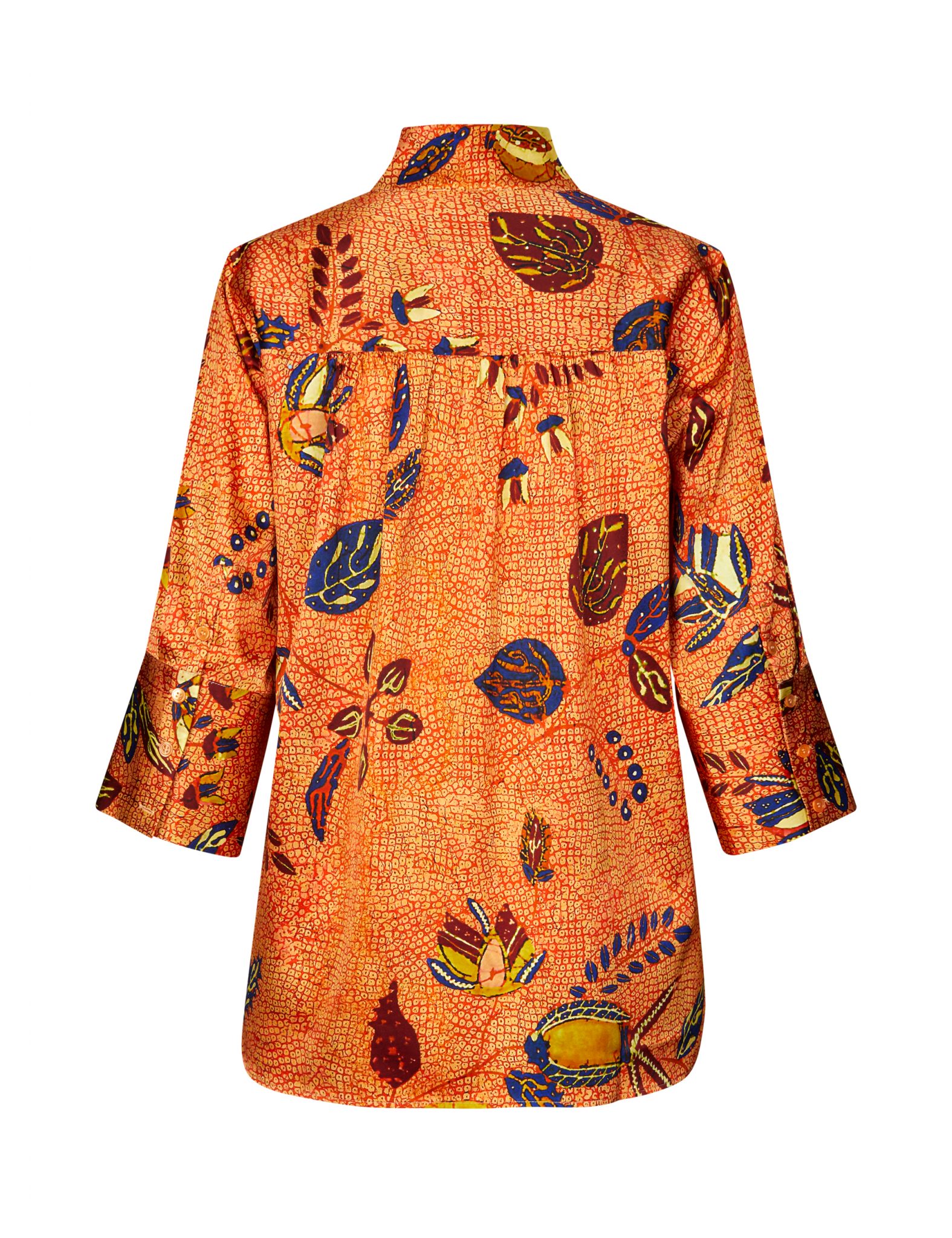 Den välkända modellen i tunikaskjorta, med ett riktigt vackert blommönster i stark sidenkvalitet, vilket gör den vacker och mångsidig med det klassiska utseendet och snittet. Klänningen har en vacker ståkrage, en 3/4-lång ärm och en serie veck i ryggen, vilket gör den väldigt rymlig och exklusiv att se på.