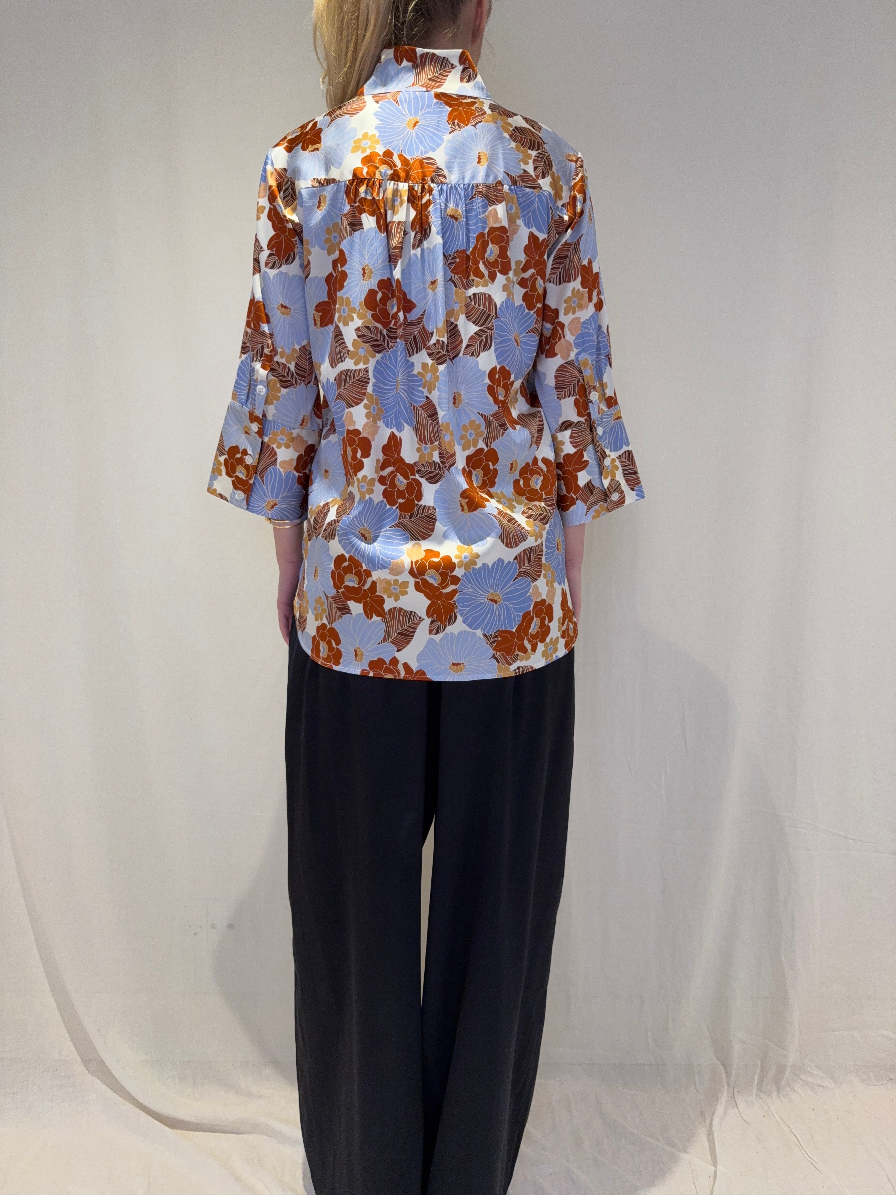 Den välkända modellen i tunikaskjorta, med ett riktigt vackert blommönster i stark sidenkvalitet, vilket gör den vacker och mångsidig med det klassiska utseendet och snittet. Klänningen har en vacker ståkrage, en 3/4-lång ärm och en serie veck i ryggen, vilket gör den väldigt rymlig och exklusiv att se på.